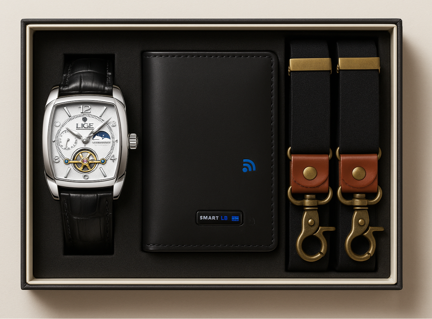 The Knight’s Prestige Set is a masterfully curated collection for the distinguished gentleman, combining refined style with practical elegance. Inside, you’ll find a sophisticated wristwatch, a sleek RFID-protected smart wallet, and classic navy suspenders with brass fittings — each secured in precision-cut black foam for a flawless presentation. Housed in a deep navy gift box, this set exudes timeless prestige and makes a statement of both luxury and purpose.