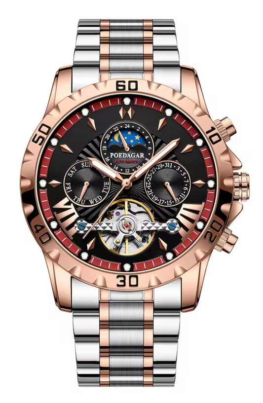 Experience the bold integration of gold and silver tones, paired with refined automatic movement and chronograph features, designed to match every horizon you chase. Whether you’re commanding a boardroom or seizing the weekend, this set ensures you do so with clarity, strength, and style.